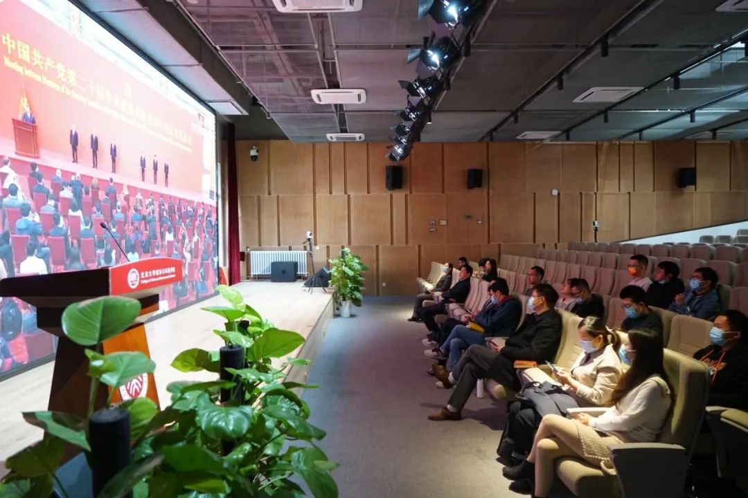 在主会场城市与环境学院303报告厅,城市与环境学院党委书记彭建,院长贺灿飞,副院长曹广忠,党委副书记张新平,党委委员、环境学系系主任卢晓霞,党委委员、自然地理与自然资源系党支部书记蒙吉军,院长助理、党政综合办公室主任刘萍,团委书记、学工办主任谭卓立,团委常务副书记宋宛儒等老师,部分师生党员、民主党派代表集中学习观看了中国共产党二十届中央政治局常委同中外记者见面会。